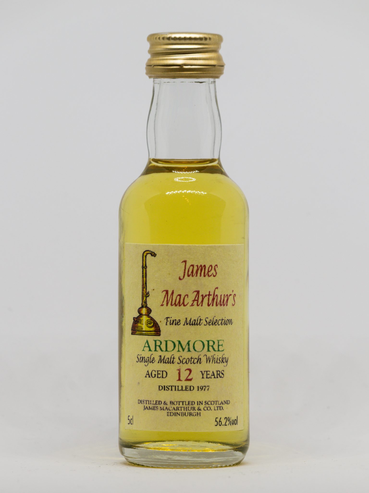 Sehr gut durch die Jahre gekommene Jahrgangs-Miniatur mit sanfter Farbe, sehr gutem Füllstand und auf dem stilvollen Etikett sehr gut ersichtlichen Angaben zu Jahrgang und Herkunft.