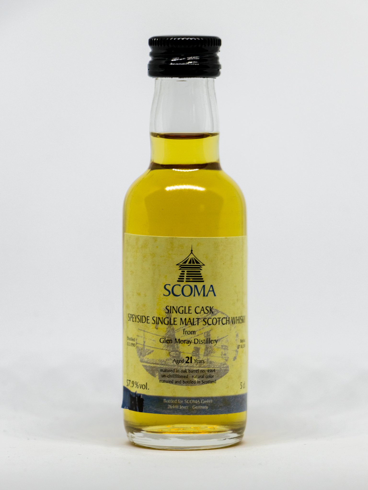Gut durch die Jahre gekommene Jahrgangs-Miniatur mit honigsanfter Farbe, gutem Füllstand und auf dem stilvollen Etikett ersichtlichen Angaben zu Jahrgang, Lagerung, Herkunft und Abfüllung.